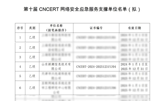 為加強網絡安全應急技術協作體系建設,提升重大突發網絡安全事件應對和保障能力,根據申報單位綜合能力及支撐國家計算機網絡應急技術處理協調中心網絡安全工作情況,經自主申報、形式審核、專家評審、研究確認等環節,山東新潮信息技術有限公司再次作為山東省唯一入選單位,被遴選為第十屆CNCERT網絡安全應急服務支撐單位(全國共59家)。