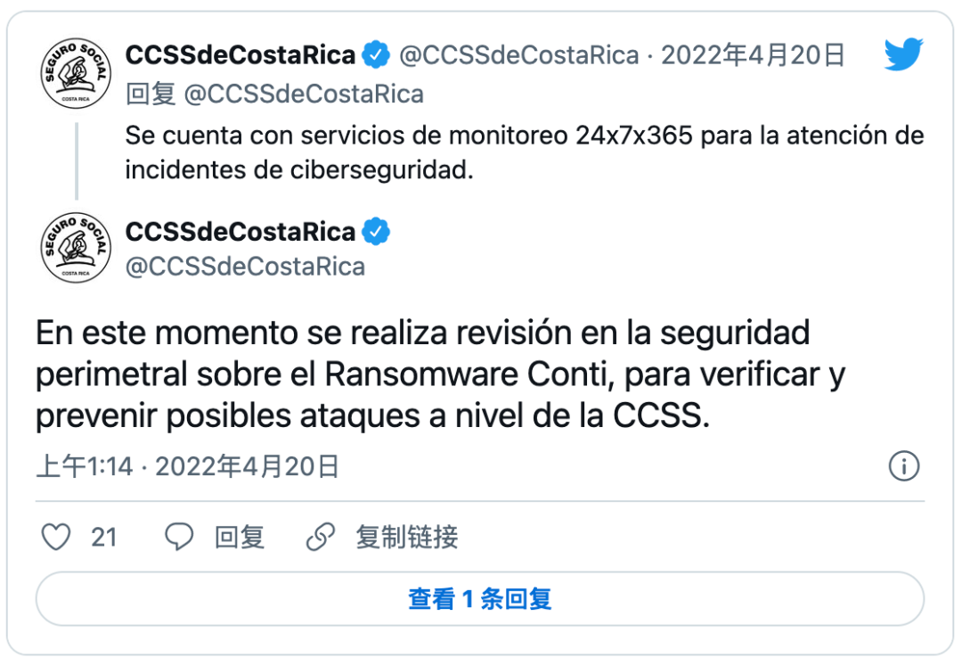 此(ci)前,4月(yue)份哥斯達黎加就(jiu)遭(zao)遇了黑客(ke)攻擊。報道稱,截至當地時間4月(yue)22日,因(yin)遭(zao)到國際黑客(ke)攻擊,哥(ge)斯達黎加部分(fen)政府公(gong)共服務網絡(luo)仍(reng)處于(yu)關閉狀(zhuang)態。