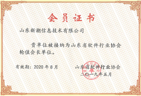 2019年5月,山東新(xin)潮(chao)信(xin)息被接納(na)為山東省(sheng)軟件行業協(xie)會輪值(zhi)會長單位