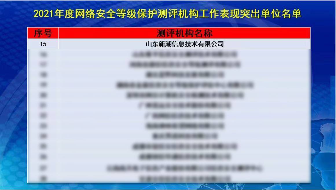 新潮信息(xi)是信息(xi)安全等級保護測評機(ji)構,中(zhong)關(guan)村信息(xi)安全測評聯盟(meng)副(fu)理事單位(wei),成(cheng)立22年來,公司始終秉承“專(zhuan)(zhuan)業、專(zhuan)(zhuan)注(zhu)、卓越”的經(jing)營(ying)理念,為(wei)(wei)國(guo)家(jia)信(xin)息事業安全提(ti)供專(zhuan)(zhuan)業的服(fu)務。新潮信(xin)息分(fen)別在20年度(du)、21年度(du)連(lian)續兩(liang)年被評為(wei)(wei)工作突出(chu)單位,這是監管機構和(he)測(ce)(ce)評聯盟對(dui)新潮等保測(ce)(ce)評工作的高度(du)肯(ken)定。