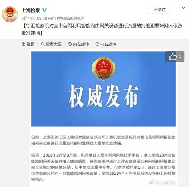 上海市徐(xu)匯檢察院對全市首例(li)利(li)用(yong)智能路(lu)由網關設(she)備進行流(liu)量(liang)劫持的犯罪嫌疑人(ren)依(yi)法批(pi)準逮捕。經查(cha),2018年2月至3月間,犯罪嫌(xian)疑人(ren)章某利用(yong)網(wang)(wang)(wang)(wang)絡(luo)技術手段,侵入全國20余臺智能路由(you)網(wang)(wang)(wang)(wang)關設備(bei)并植(zhi)入蠕蟲病(bing)毒,將終端用(yong)戶通過上述設備(bei)聯系公共網(wang)(wang)(wang)(wang)絡(luo)的(de)網(wang)(wang)(wang)(wang)址(zhi)重(zhong)定(ding)向至其(qi)指(zhi)定(ding)的(de)賭博網(wang)(wang)(wang)(wang)站,從(cong)中(zhong)(zhong)牟取流(liu)量中(zhong)(zhong)介費。僅(jin)章某被抓前1日(ri),通過上海某網(wang)(wang)(wang)(wang)絡(luo)技術有限(xian)公司的(de)一臺智能路由(you)網(wang)(wang)(wang)(wang)關設備(bei),全國38194個(ge)不同電腦(nao)系統(tong)設備(bei)的(de)上網(wang)(wang)(wang)(wang)數據被修改。