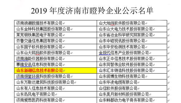 2019年8月,新潮信息被認定為2019年度濟南市級瞪羚企業