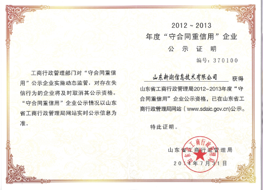 2014年7月,我公司獲得由山東(dong)省工商行政管理局頒發的守合同重信用企(qi)業證書。
