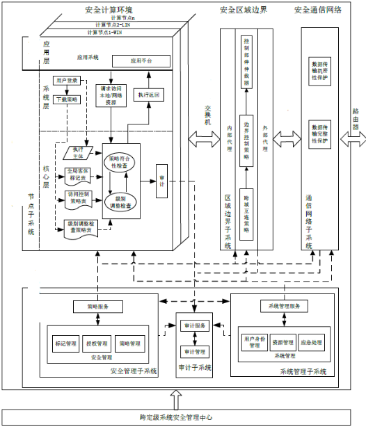 第三級系(xi)統安全(quan)保護環境設(she)計示例:根據“一個(ge)中心(xin)”管(guan)(guan)理(li)下(xia)的(de)(de)“三重保(bao)護(hu)”體(ti)系(xi)框(kuang)架(jia),構建安(an)(an)全(quan)(quan)(quan)(quan)機制和(he)(he)策略,形成(cheng)定級系(xi)統(tong)的(de)(de)安(an)(an)全(quan)(quan)(quan)(quan)保(bao)護(hu)環境(jing)。該環境(jing)分(fen)(fen)為(wei)如下(xia)四部分(fen)(fen):安(an)(an)全(quan)(quan)(quan)(quan)計算環境(jing)、安(an)(an)全(quan)(quan)(quan)(quan)區域邊界(jie)、安(an)(an)全(quan)(quan)(quan)(quan)通信網絡和(he)(he)安(an)(an)全(quan)(quan)(quan)(quan)管(guan)(guan)理(li)中心(xin)。每個(ge)部分(fen)(fen)由1個(ge)或若干個(ge)子(zi)系(xi)統(tong)(安(an)(an)全(quan)(quan)(quan)(quan)保(bao)護(hu)部件)組成(cheng),子(zi)系(xi)統(tong)具有安(an)(an)全(quan)(quan)(quan)(quan)保(bao)護(hu)功(gong)能獨立完整、調用接口簡潔(jie)、與安(an)(an)全(quan)(quan)(quan)(quan)產(chan)品相對應和(he)(he)易于管(guan)(guan)理(li)等特征。安(an)(an)全(quan)(quan)(quan)(quan)計算環境(jing)可細分(fen)(fen)為(wei)節(jie)點子(zi)系(xi)統(tong)和(he)(he)典型應用支撐子(zi)系(xi)統(tong);安(an)(an)全(quan)(quan)(quan)(quan)管(guan)(guan)理(li)中心(xin)可細分(fen)(fen)為(wei)系(xi)統(tong)管(guan)(guan)理(li)子(zi)系(xi)統(tong)、安(an)(an)全(quan)(quan)(quan)(quan)管(guan)(guan)理(li)子(zi)系(xi)統(tong)和(he)(he)審計子(zi)系(xi)統(tong)。
